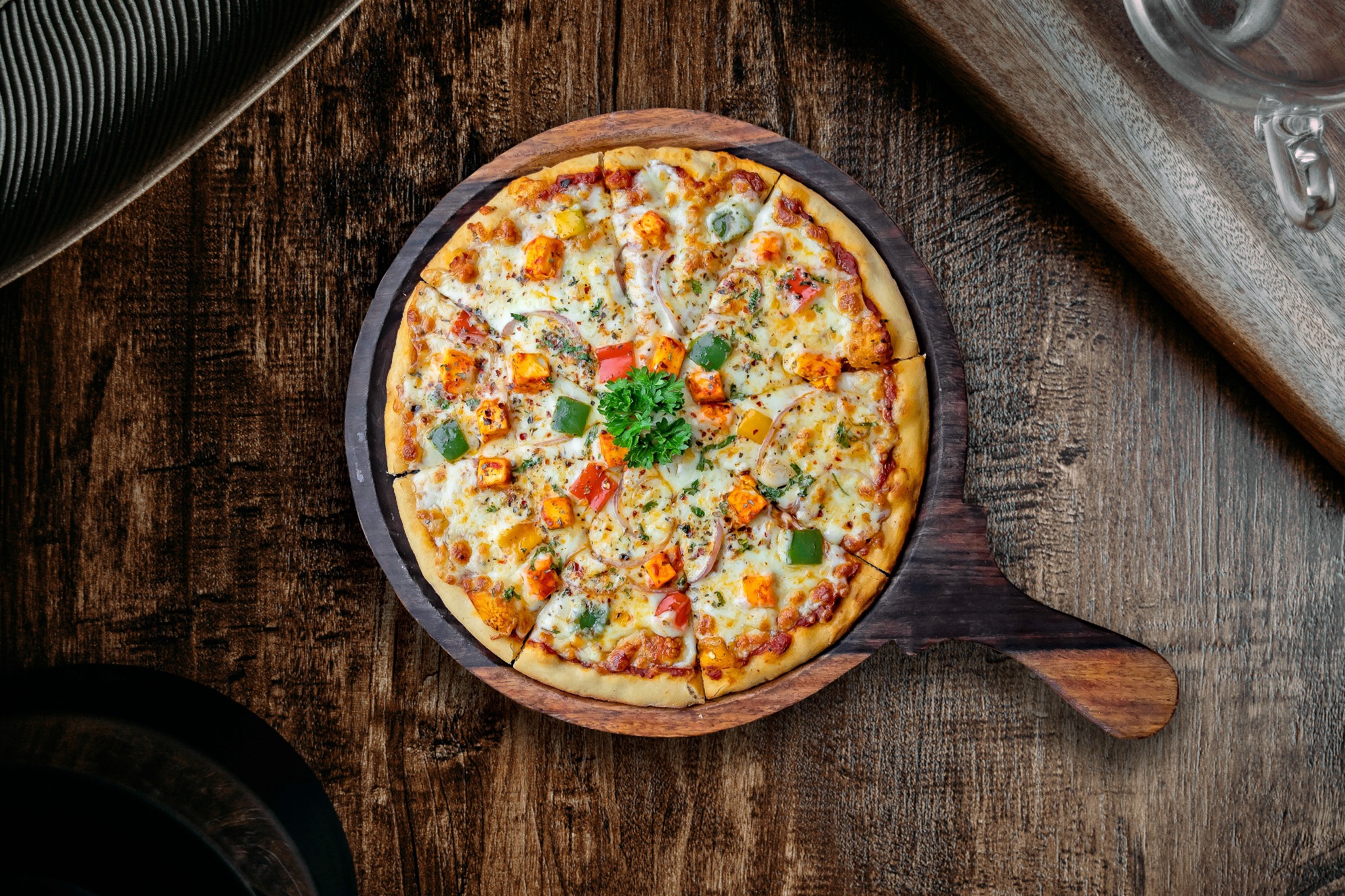 Aluat pizza, sos roșii, mozzarella, brie, gorgonzola, parmezan, salam picant, oregano