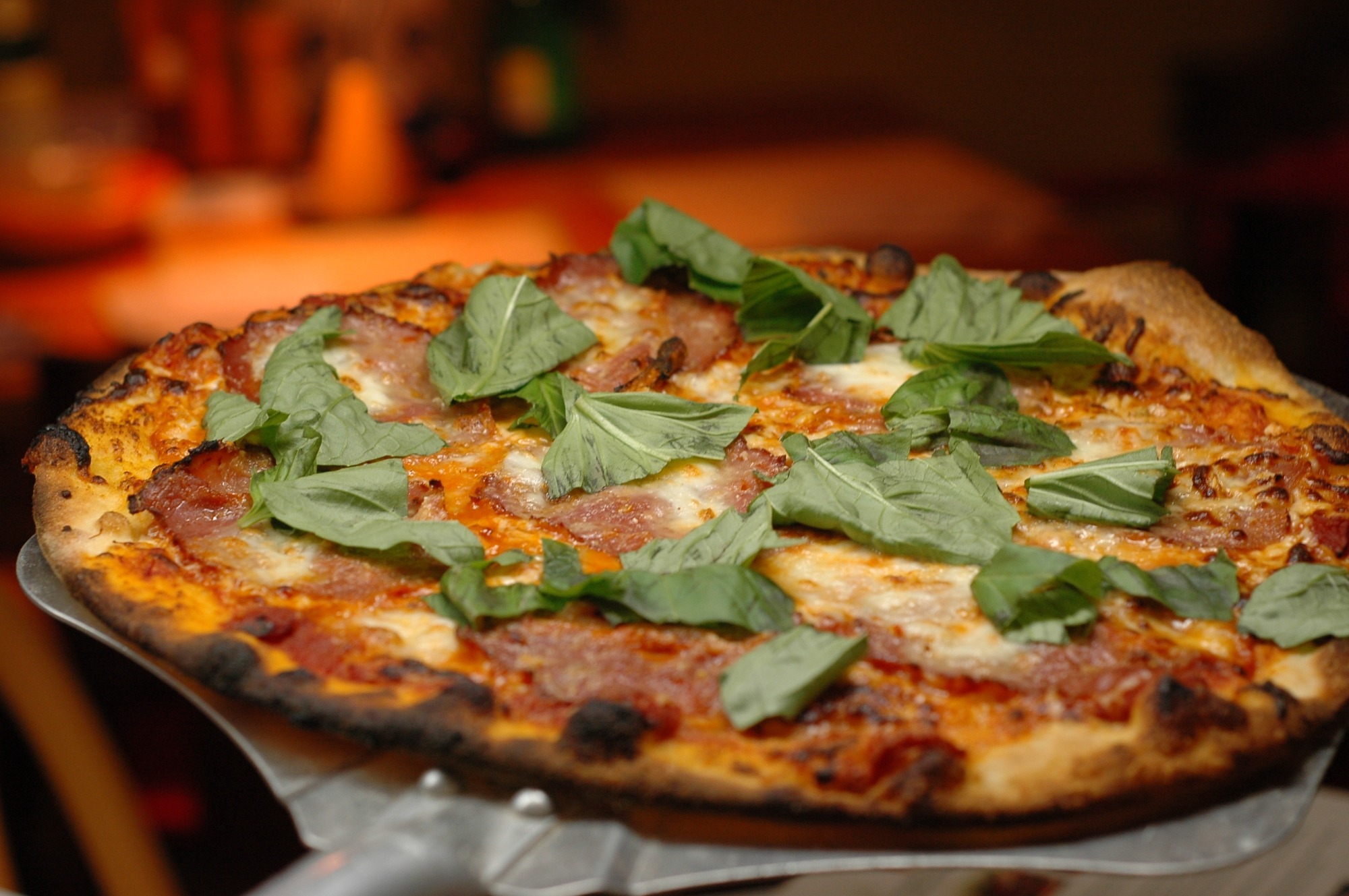Aluat pizza, sos roșii, mozzarella, brie, speck, roșii cherry, busuioc